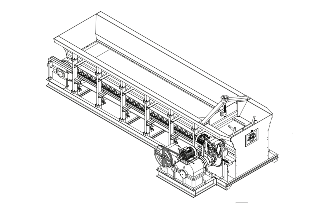 Üretim hattının başında besleme ünitesi olarak kullanılan bu ilk makine, ham maddenin ayarlanabilir miktarlarda akışını sağlar. Ayrıca üretim hattı arasında bir depolama ünitesi olarak da kurulabilir. Birden fazla kutulu besleyici kullanılması, farklı malzemelerin karıştırılmasına olanak tanır. Dayanıklı kauçuk banttan oluşan bir hareket mekanizmasına sahiptir. Kauçuk bant, 5 katlı kord tipindedir ve aşınmaya karşı dirençlidir. Hazne (bunker) kısmı da aşınmaya dayanıklıdır. Makinenin tüm parçaları, dünya standartlarındaki ağır çalışma koşullarına uygun olarak seçilmiştir.